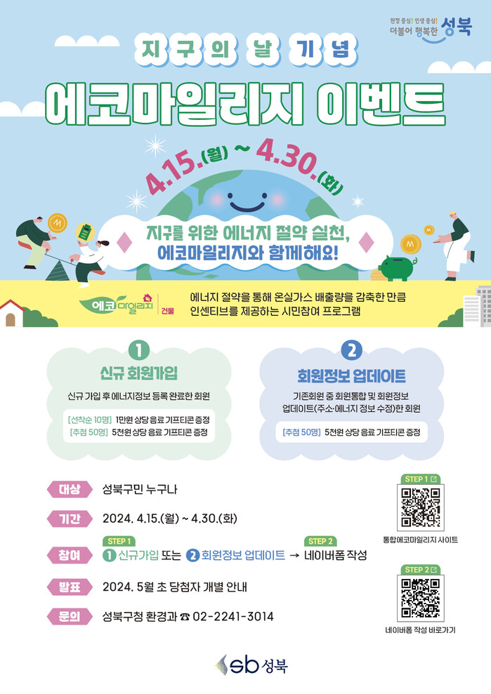 [시민일보 = 여영준 기자] 서울 성북구(구청장 이승로)가 오는 15~30일 지구의 날을 맞아 기후변화 및 탄소중립에 관한 관심을 높이고 에너지 절약 실천에 동참할 수 있도록 에코마일리지 가입 이벤트를 진행한다.