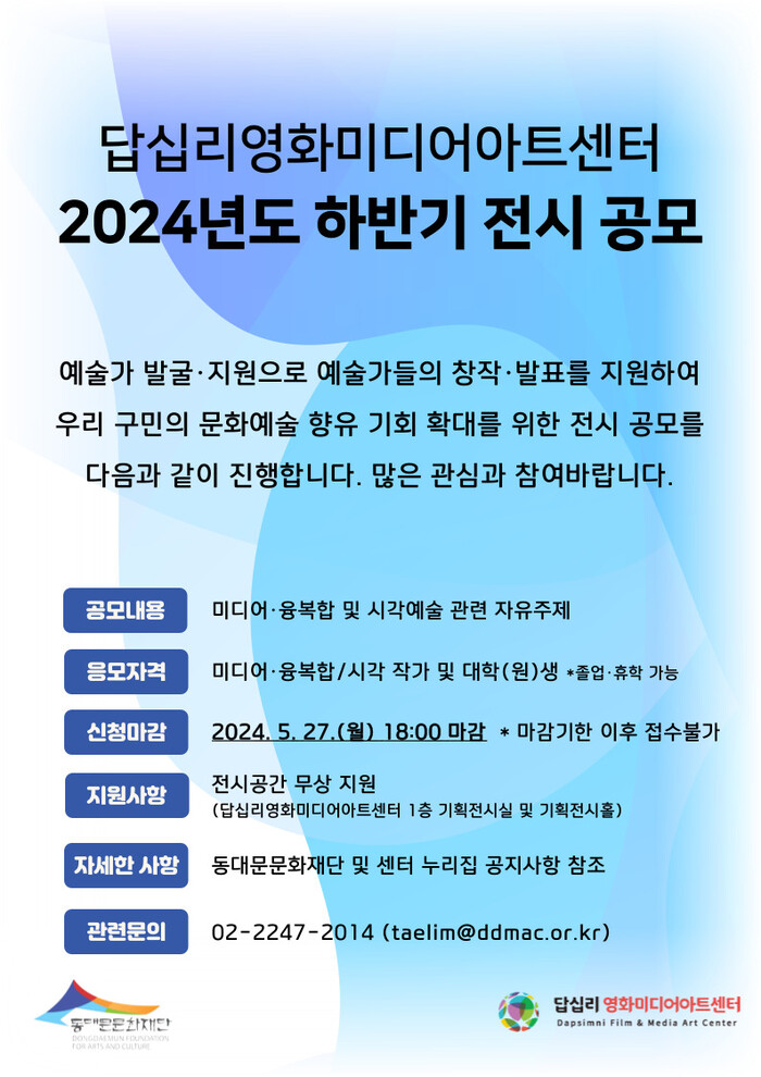 접수기한은 5. 27.(월) 18:00까지며, 답십리영화미디어아트센터 홈페이지 공지사항에서 자세한 내용을 확인 후 첨부된 서식에 따라 필요한 서류를 전자우편(taelim@ddmac.or.kr)으로 제출하면 된다.