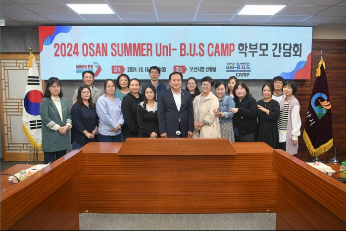경기 오산시가 최근 시청 상황실에서 2024 오산 썸머 유니버스 캠프 학부모 간담회를 개최했다. 사진은 간담회에 참석한 이권재 시장(가운데)과 학부모들이 기념 촬영하는 모습. (사진=오산시청 제공)