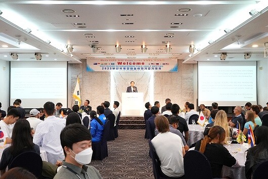 [부산=최성일 기자] 하윤수 부산광역시교육감이 지난 9일 오후 7시 수영구 아쿠아펠리스호텔에서 육현표 대한육상연맹 회장, 참가 선수단 등이 참석한 가운데 열린 ‘2023년 부산 국제장대높이뛰기 경기대회 개회식’에서 인사말을 하고 있다.