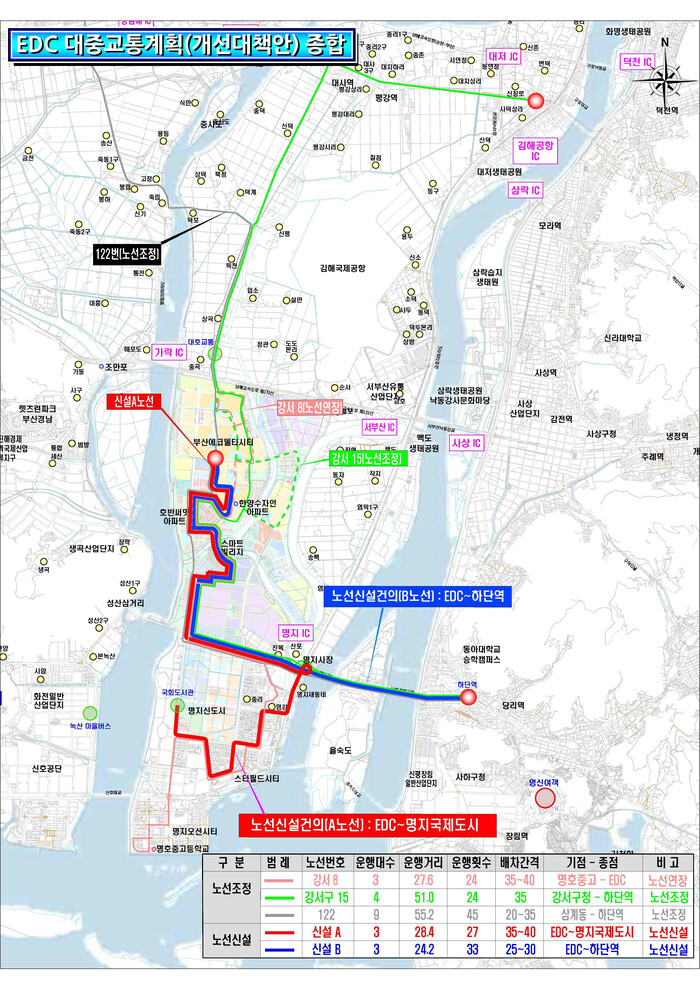 노선은 ▲에코델타시티~명지새동네~국회도서관(28.2㎞) 구간과 ▲에코델타시티~강서경찰서~하단 구간으로 배차 간격은 각각 30~35분, 30분이다.