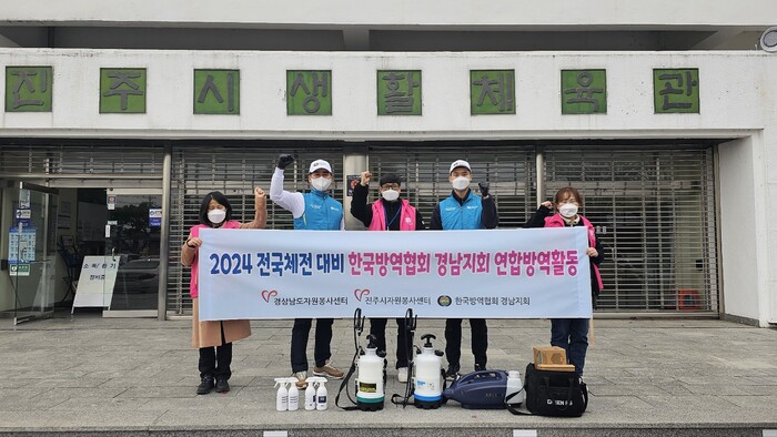 진주시자원봉사센터는 29일 근대 5종 펜싱 경기가 열리는 진주생활체육관에서 한국방역협회 경남지회와 ‘2024년 전국체전 대비 체육시설 릴레이 연합방역’ 활동을 전개했다.