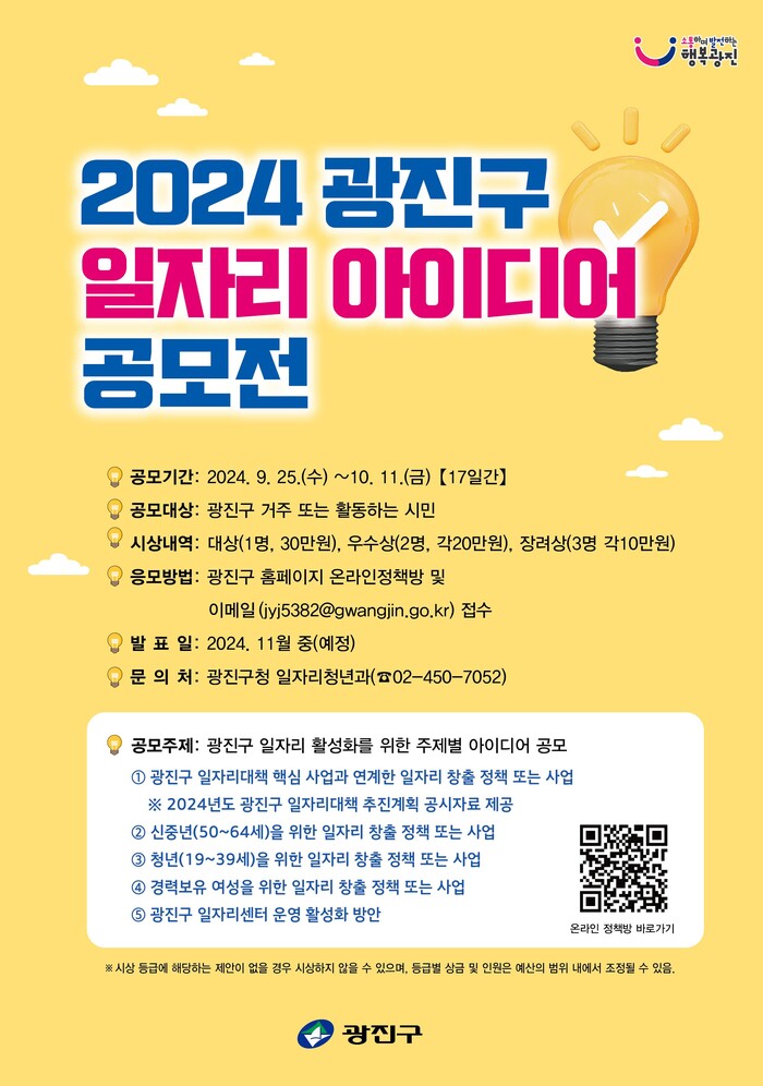 [시민일보 = 여영준 기자] 광진구(구청장 김경호)가 구민 수요에 맞춘 일자리 활성화를 위해 오는 11일까지 ‘2024 광진구 일자리 아이디어 공모전’을 개최한다.