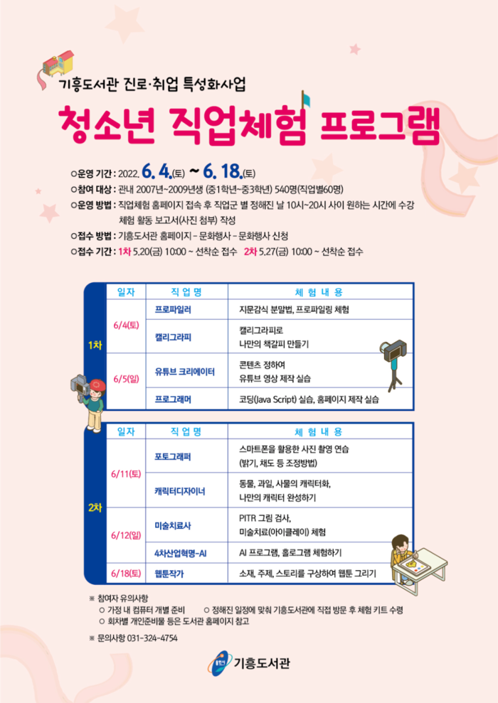 기흥도서관은 오는 6월4일부터 18일까지 총 9개의 직업군을 체험할 수 있는 ‘청소년 직업체험 프로그램’을 마련했다.