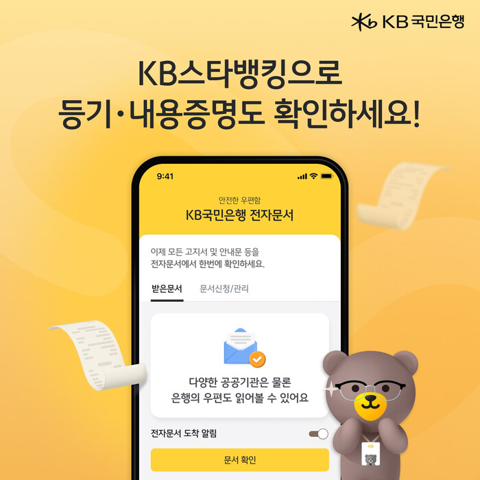 KB국민은행 관계자는 “은행에서 발송하는 중요한 안내문을 고객이 보다 안전하고 편리하게 받아볼 수 있게 됐다”며 “앞으로도 일상과 금융을 연결하는 생활금융플랫폼으로 발전해 나가겠다”고 전했다.