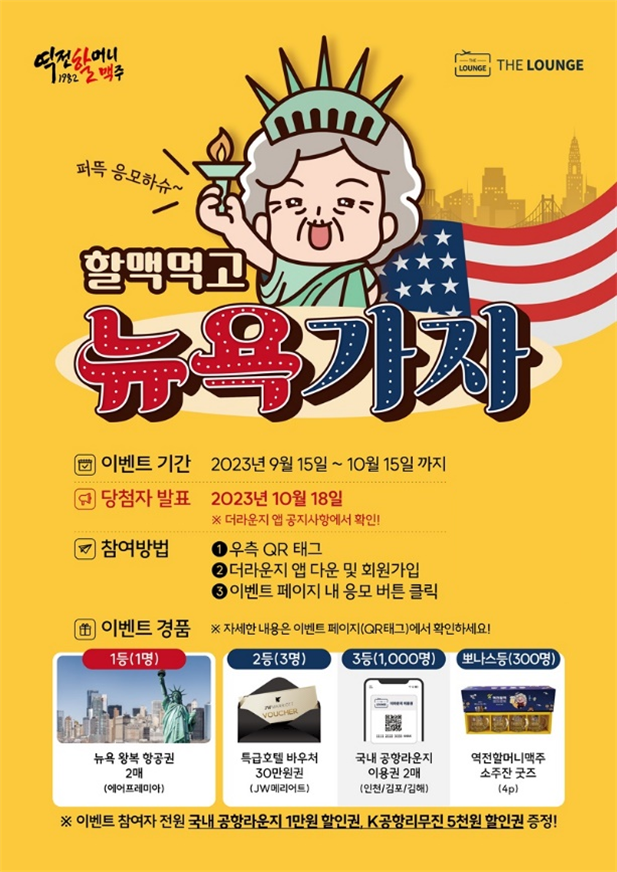 이벤트 참여 방법은 간단하다. 가까운 역전할머니맥주 매장에 방문해 ‘할맥먹고 뉴욕가자’ 포스터 내에 있는 QR코드를 찍고 더라운지 앱을 다운로드한 후 회원가입을 마치고 해당 이벤트 페이지 내 응모 버튼을 클릭하면 참여가 완료된다.