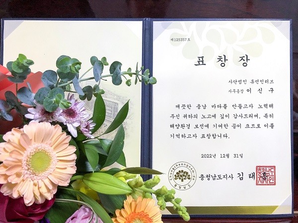| ▲ 국제구호개발NGO 휴먼인러브가 충남지역 해양환경 보전에 기여한 공로를 인정받아 충청남도지사 표창을 수상했다. (사)휴먼인러브 제공 |