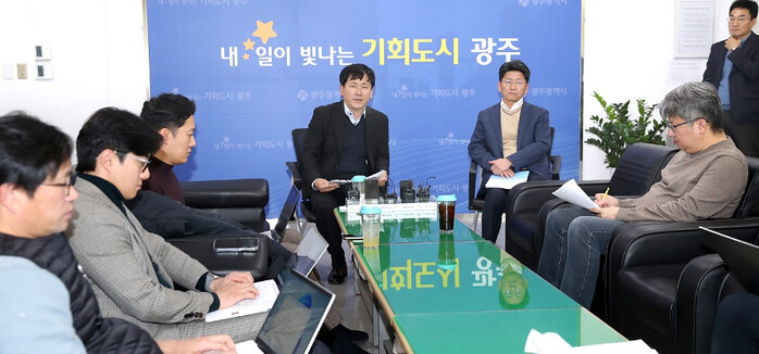 [광주=정찬남 기자] 이상갑 문화경제부시장이 11일 오후 시청 5층 기자실에서 차담회를 갖고 2025년도 국비예산 확정 등에 대해 설명하고 있다. / 광주광역시 제공