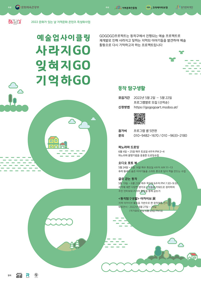 사업 관련 자세한 내용은 ‘고고고 프로젝트’ 누리집 또는 동작문화재단 문화정책팀으로 문의하면 된다.