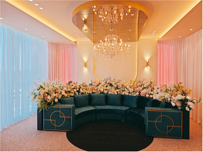 결혼식의 주인공인 신부를 맞이하는 신부대기실은 화이트와 핑크로 두가지 연출을 할 수 있는 커튼으로 벽을 감쌌고 화려한 상들리에로 고급스러운 분위기를 연출한다.