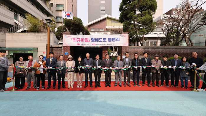 박강수 서울 마포구청장은 최근 고(故) 최규하 대통령 가옥 앞(동교로15길 10)에서 열린 ‘최규하길’ 명예도로 명명식에 참석했다. 사진은 '최규하길' 명예도로 명명식에서 박 구청장을 비롯한 참석자들이 테이프를 자르고 있는 모습. (사진=마포구청제공)