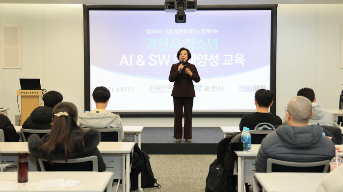 경기 과천시가 펄어비스 사옥에서 최근 ‘과천시 청소년 인공지능·소프트웨어 인재 양성 교육 프로그램’의 성과공유회를 개최했다. 이번 행사는 지난 7월부터 6개월간 운영한 교육 프로그램의 성과를 공유하고, 수강생들의 창의적 학습 결과물을 선보이기 위해 마련됐다. 사진은 신계용 과천시장이 과천시 청소년 AI SW인재양성과정교육 성과발표회에서 인사말을 하고 있는 모습. (사진=과천시청 제공)