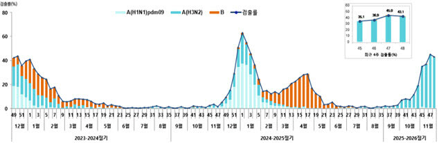 [최근 3년간 주별 인플루엔자 바이러스 검출 현황('25.11.29. 기준), 출처: 질병관리청]