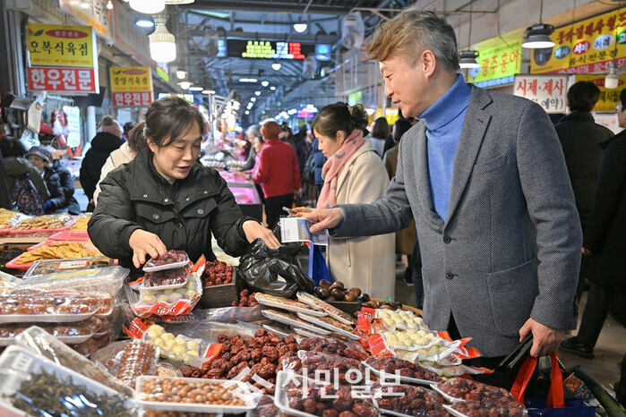 [광주=정찬남 기자] 김이강 광주광역시 서구청장이 12일 민족 대명절 설을 앞두고 양동전통시장에서 전통시장 활성화 및 상권 회복을 위해 온누리상품권으로 제수용품 등을 구입하고 있다./ 광주 서구 제공