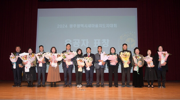 [광주=정찬남 기자] 강기정 광주광역시장(사진 가운데)이 27일 오후 시청 대회의실에서 열린 2024 광주 새마을지도자대회에 참석해 유공자 표창을 한 후 수상자들과 함께 기념촬영을 하고 있다. /광주광역시 제공