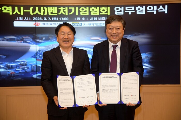 광주광역시(시장 강기정)는 7일 오후 시청 비즈니스룸에서 벤처기업협회와 ‘광주 인공지능(AI) 산업 생태계 조성을 위한 업무협약’을 체결하고 잠재력 이 높은 인공지능기업 발굴과 기업 성장 지원에 적극 협력키로 했다.