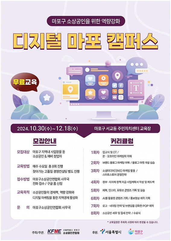 마포구 소상공인연합회가 주최·주관하고 서울시와 마포구가 후원하는 서울소상공인 디지털 마포 캠퍼스에서 소상공인들을 대상으로 한 디지털 마케팅 교육과정의 수강생을 모집한다.