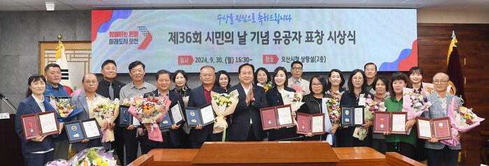 경기 오산시는 최근 2024년 제36회 시민의 날 기념 ‘유공자 표창 시상식’을 개최했다. 사진은 수여식 후, 이권재 시장(가운데)이 수상자들과 기념 촬영하는 모습. (사진=오산시청 제공)