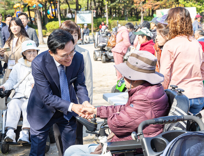 진교훈 서울 강서구청장이 최근 방화근린공원에서 열린 ‘제21회 장애인 어울림한마당’을 찾아 장애인들과 함께 소통하는 시간을 보냈다. 사진은 행사에 참석한 진 구청장이 한 장애인과 인사를 나누는 모습. (서울=강서구청 제공)