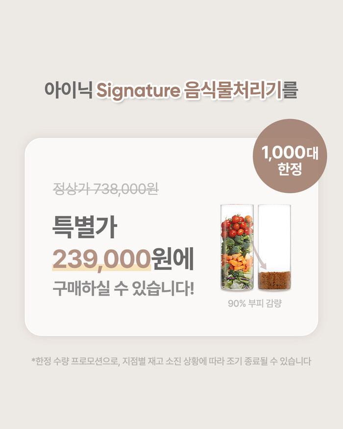 아이닉은 시그니처 음식물처리기 'iFD01'을 전국 116개점 이마트·일렉트로마트에 입점하는 것과 동시에 고래잇 페스타를 통해 최저가 혜택을 제공할 계획이다. 8월 1일(금)부터 3일(일)까지 3일간 1000대 한정 수량으로 출시 이후 최저가인 23만 원대 특별가로 공급한다.