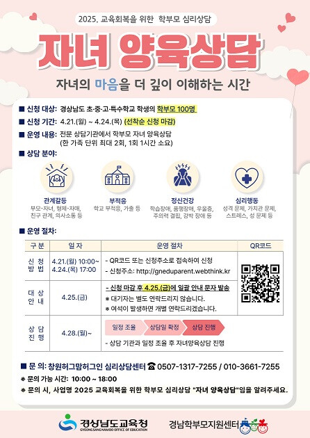 김보상 학교혁신과장은 “학부모가 정서적으로 안정되어야 자녀와의 관계도 긍정적으로 변화할 수 있다”라며, “이번 심리상담 지원은 학부모 개인을 돕는 차원을 넘어 가정의 회복과 학교 교육의 효과까지 높이는 소중한 기회가 될 것이다”라고 전했다.
