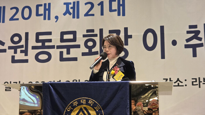 아주대학교 경영대학원 수원동문회는 24일 오후 수원 라비포레(구 수원 리츠호텔)에서 제20·21대 수원동문회장 이·취임식을 열고 김영례 신임 회장의 취임을 알렸다. 이날 행사에는 아주대학교 경영대학원 심규철 원장, 박병택 총동문회장, 아경장학재단 김기권 이사장, 동문 및 내외 귀빈 등 300여 명이 참석했다.