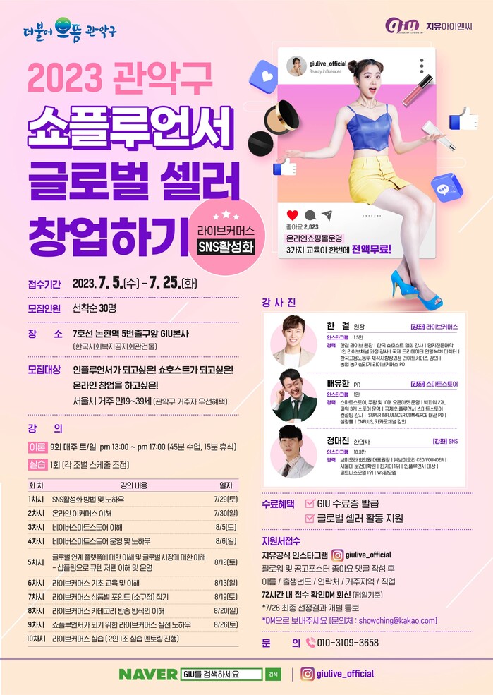교육 프로그램은 ▲온라인 전자상거래의 이해 ▲네이버 스마트스토어 운영 및 노하우 ▲라이브커머스 기초 교육 ▲상품별 포인트 잡기 및 방송 등으로 총 10회차로 구성했으며 후반부에는 방송 실습 체험과 일대일 멘토링도 준비되어 있다.