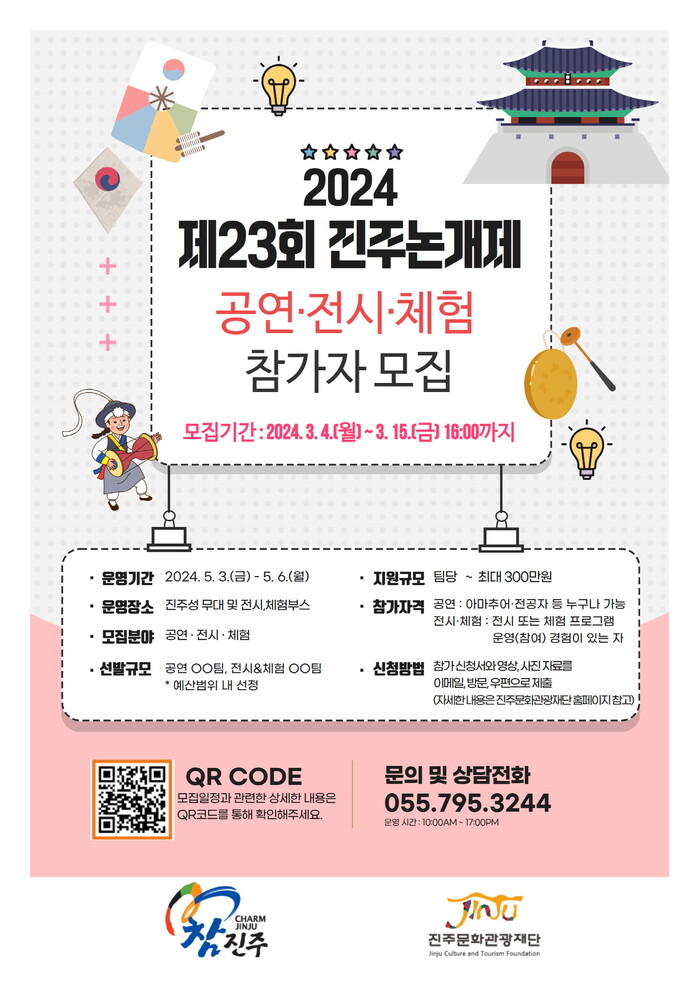 (재)진주문화관광재단은 오는 5월 3일부터 6일까지 4일간 진주성 일원에서 열릴 예정인 ‘제23회 진주논개제’ 프로그램 참가자를 공개모집한다.