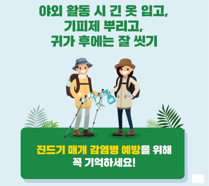 특히 야외활동이나 작업하기 전에 진드기 기피제를 사용하면 4~6시간 예방 효과가 있으므로 진드기 기피제 사용하는 것을 적극 권장한다.