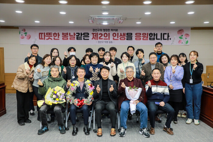 경기 수원시 권선구는 24일 권선구청 상황실에서 2024년 하반기 퇴직 공무원 및 2025년 퇴직준비교육 대상자 격려품 및 임용장 전달식을 개최했다. 이날 행사에는 김종석 권선구청장을 비롯해 후배 공직자들이 참석해 명예로운 공직생활 마무리와 새로운 인생 출발을 축하하는 자리를 가졌다. 사진은 김 구청장(앞줄 가운데)이 퇴직 공무원들과 기념촬영을 하고 있는 모습. (사진=권선구청 제공)