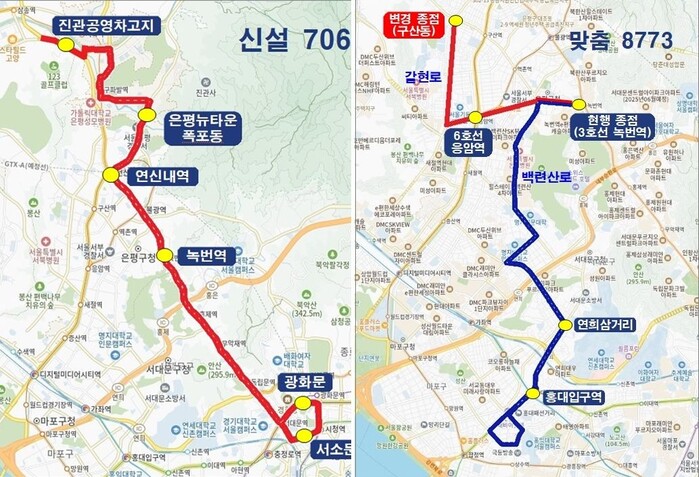 맞춤버스 8773번도 운행구간과 운행차량을 늘여 출퇴근 시간대 이용 주민들의 편의를 높인다. 기존 2대의 차량으로 녹번역~홍대입구역을 운행하던 버스를, 구산동~녹번역 구간의 15개 정류장을 추가해 구산동~홍대입구역 구간으로 11.1㎞ 연장하고 차량도 3대를 추가 배차해 운행 간격을 40분에서 20분으로 줄여 운행한다.