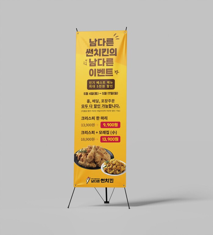 남다른썬치킨의 대표 메뉴인 크리스피 치킨은 홀기준 1만3900원, 크리스피 치킨+모래집튀김小세트는 1만8900원 이다. 이번 프로모션 행사에서는 크리스피 치킨을 9900원, 크리스피치킨+모래집튀김小세트를 1만3900원의 가격으로 만나볼 수 있다.