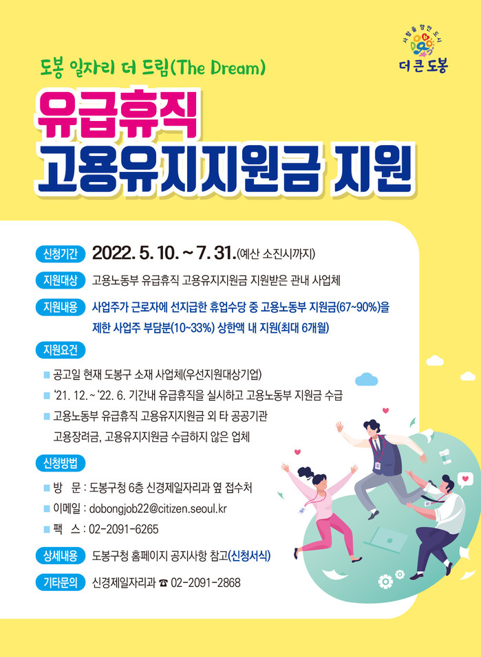 [시민일보 = 박준우 기자]서울 도봉구가 근로자를 위해 유급휴직을 실시한 사업체에 '도봉 일자리 더 드림 사업을 통한 유급휴직 고용유지 지원금을 지원한다고 13일 밝혔다.