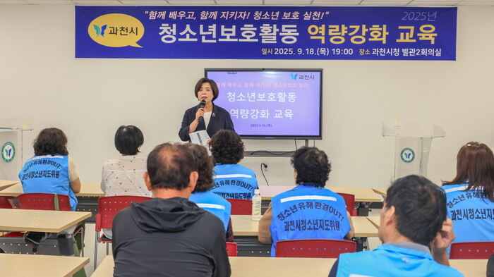 경기 과천시가 최근 청소년지도위원, 유해환경감시단, 문원초 아버지회 등 청소년 선도·보호 활동 단체 40여명을 대상으로 ‘함께 배우고, 함께 지키자! 청소년 보호실천!’이라는 주제로 역량 강화 교육을 진행했다. 사진은 교육에 참여한 신계용 시장이 인사말을 하는 모습. (사진=과천시청 제공)
