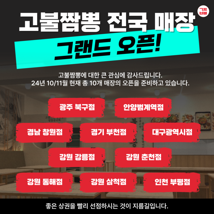 고불짬뽕 기세진 대표는 “최근 가맹 문의가 폭주하고 있어 당분간은 신규 10개 지점의 오픈에 집중하고자 한다”며 “대표이사가 직접 발로 뛰며 매장의 세세한 부분까지 챙기고자 하는 노력이므로 기다리고 계시는 많은 창업자분들의 양해를 구한다”고 전했다.