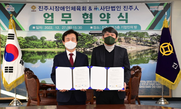 [진주=최성일 기자] 진주시장애인체육회(회장 조규일)와 사)진주인(대표 장혁)은 27일 진주시청 기업인의 방에서 지역사회 발전을 위한 업무협약을 체결했다.
