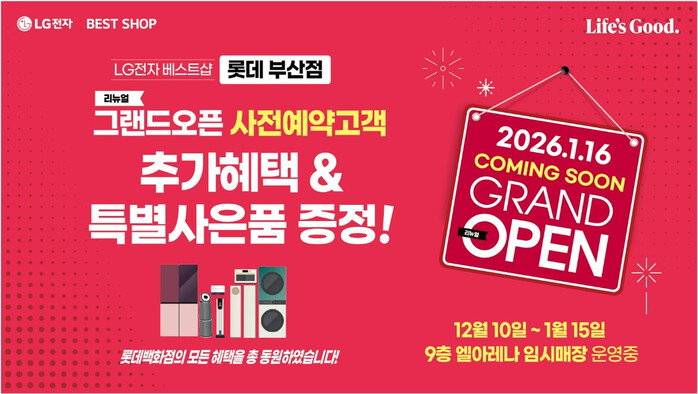 LG전자 베스트샵 롯데 부산점은 리뉴얼 오픈을 기념해 2025년 12월 10일부터 2026년 1월 15일까지 사전예약 행사를 운영한다. 해당 기간 동안 고객들은 보다 합리적인 조건으로 프리미엄 가전을 상담하고 구매 혜택을 받을 수 있다.