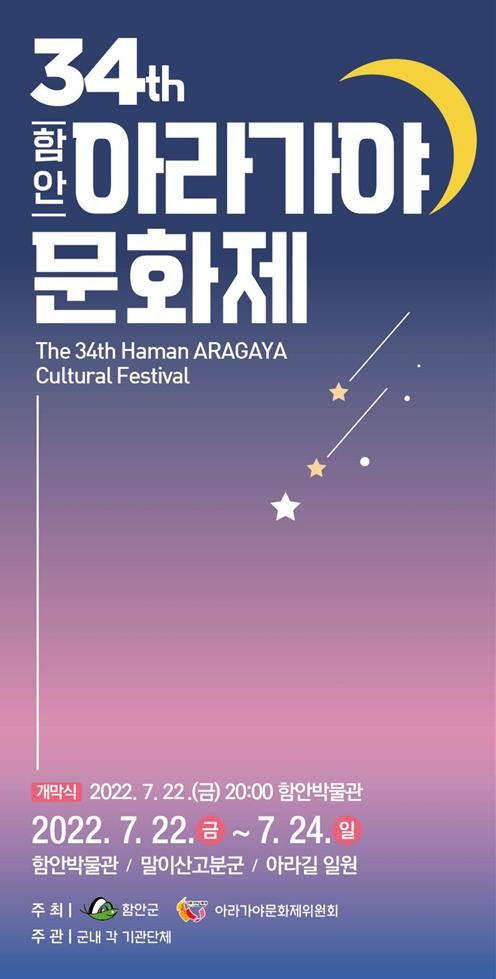 22일(금)에는 식전 행사로 아라 초등학교에서 함안 박물관까지 아라 대왕 행렬이 진행된다. 이어서 함안 박물관에서 열리는 개막식에는 아라 가야의 우수한 문화를 나팔, 대평소, 칼춤 등을 활용해 왕의 행차를 표현한 아라 가야 대군물(大軍物) 공연이 열리고, 말이산 고분군의 밤하늘을 드론 으로 화려하게 수놓는 말이산 고분군 세계 유산 등재 기원 드론 라이트쇼와 미디어 파사드를 선보인다.