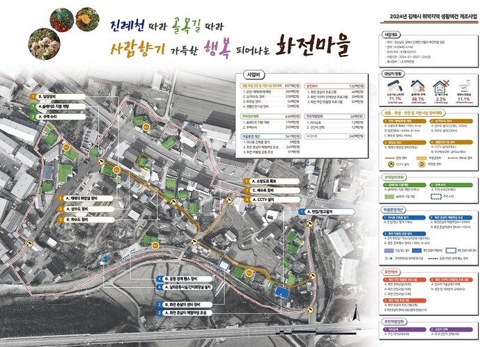 사업대상지로 선정된 진례면 화전마을은 고속도로, 철도, 공장으로 둘러싸인 협소한 마을 안길로 인해 화재 시 소방차 진입이 불가능하고 인근 공장·생활하수가 지하로 유입돼 주민 위생을 위협하고 있다.