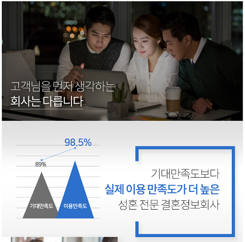 성혼 중심 결혼정보업체 노블레스 수현이 밝힌 자사 NCS 결혼상담 기대만족도 평가지수 중 상담만족도(가입 프로그램, 활동 안내, 서류 인증, 성혼비)는 85%로 집계됐다. 전문성 만족도(전문성, 친절성)는 93%에 달하는 것으로 나타났다.