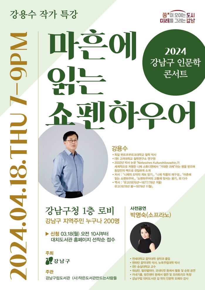 인문학 콘서트 참가 신청은 오는 25일부터 강남구립도서관 통합홈페이지 또는 대치도서관 홈페이지에서 받으며, 선착순 200여명이다.