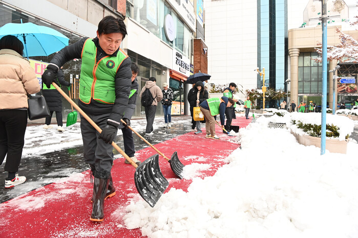 조용익 경기 부천시장이 최근 제설취약구간인 부천역 마루광장을 찾아 도로·시설 등 현장과 제설장비 현황을 직접 점검하고, 시민 안전과 피해 최소화를 위해 철저한 대응을 강조했다. 사진은 조 시장이 제설작업 현장을 찾아 폭설 대응 상황을 점검한 뒤 제설작업에 동참하고 있는 모습. (사진=부천시청 제공)