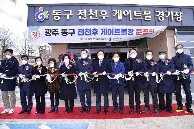 [광주=정찬남 기자] 이용섭 광주광역시장(좌측부터 6번)이 30일 오후 동구 동명동에 들어선 '동구 전천후 게이트볼 경기장' 준공식에 참석해 임택 동구청장, 시·구의원 등 내빈들과 테이프커팅을 하고 있다.