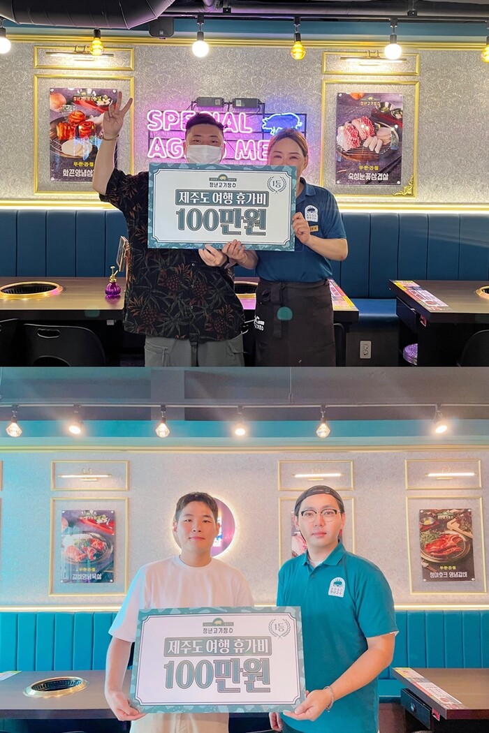 청년고기장수는 지난 5월 5일부터 6월 30일까지 매장에서 식사를 한 고객들을 대상으로 추첨을 통해 여름 휴가비를 지원하는 이벤트를 펼친 결과, 부산사상점과 경기양평점을 방문한 고객이 각각 1등 제주도 여행 휴가비 100만원 당첨의 행운을 안았다고 전했다.