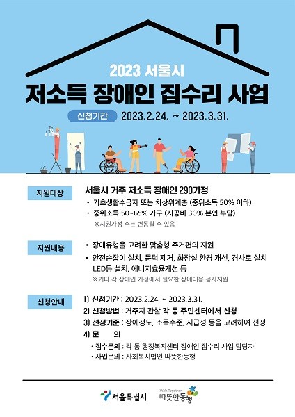 복권기금으로 지원되는 본 사업은 저소득 장애인을 대상으로 장애 특성별 맞춤형 공간복지를 위해 마련된 것으로, 대상 가구를 100가구에서 290가구로 대폭 확대했다. 신청방법은 주소지 관할 행정복지센터를 방문해 3월 31일까지 신청할 수 있다. 신청 자격은 서울시 내 거주하는 저소득 장애인으로 기초생활수급자와 차상위계층 가구 그리고 기준 중위소득 50~65%이하 가구(단, 개조비 30% 본인부담)이며 임차가구의 경우 주택 소유주가 공사 허가 및 1년 이상의 거주를 동의해야 한다.