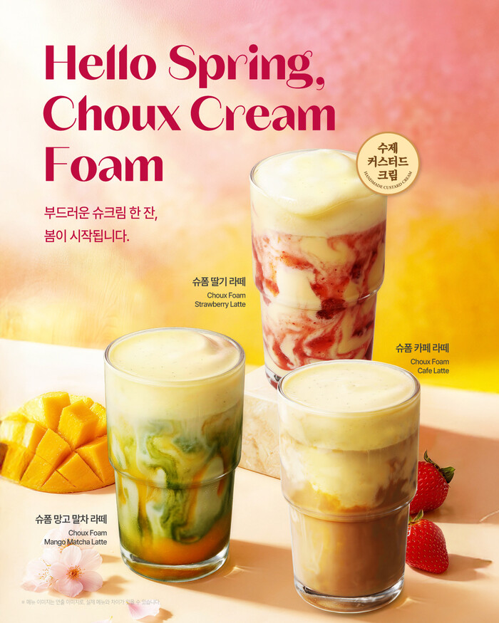 이번 신메뉴는 ‘봄’, ‘부드러움’, ‘화사함’을 테마로 기획됐다. 매장에서 직접 만든 수제 커스터드 슈크림을 활용해 음료의 구성 완성도를 높인 것이 특징이다.