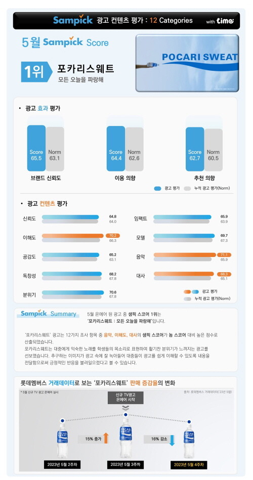 지난달 온에어한 TVC 중 1위를 차지한 광고는 포카리스웨트 ‘모든 오늘을 파랑해’ 편이었다. 광고 효과 및 콘텐츠 평가 총점이 806.6점으로 조사 대상 후보 중 가장 높았다.