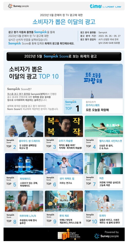 롯데멤버스(대표이사 김혜주)가 AI 광고 평가 자동화 솔루션 샘픽(Sampick)을 통해 전국 25~54세 소비자 500명에게 설문한 결과를 바탕으로 ‘소비자가 뽑은 5월의 광고’ 1~10위를 발표한다.
