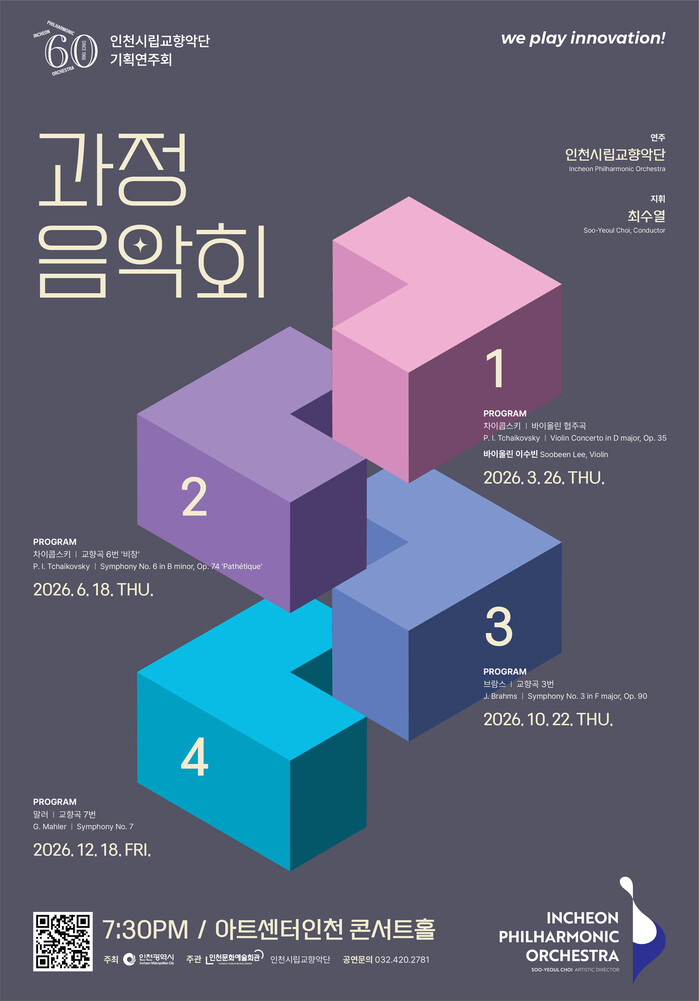 올해 <과정음악회>는 총 4회에 걸쳐 진행된다. 3월 26일 첫 무대는 인천시립교향악단 ‘올해의 예술가’로 선정된 바이올리니스트 이수빈과 함께 시리즈의 시작을 알린다. 차이콥스키의 <바이올린 협주곡>을 통해 작품이 완성되어 가는 흐름을 무대 위에서 직접 보여줄 예정이다. 이어 6월 18일에는 차이콥스키 <교향곡 6번> ‘비창’, 10월 22일에는 브람스 <교향곡 3번>, 시리즈의 마지막인 12월 18일에는 말러 <교향곡 7번>을 선보인다.
