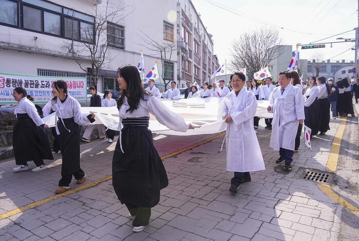 [광주=정찬남 기자] 강기정 광주광역시장이 7일 오후 남구 수피아여고에서 열린 제106주년 3·1절 기념 '광주 3·10 독립만세운동' 재현행사에 참석해 학생들과 수피아여고에서 양림오거리까지 행진하며 만세운동을 재현하고 있다./광주광역시 제공
